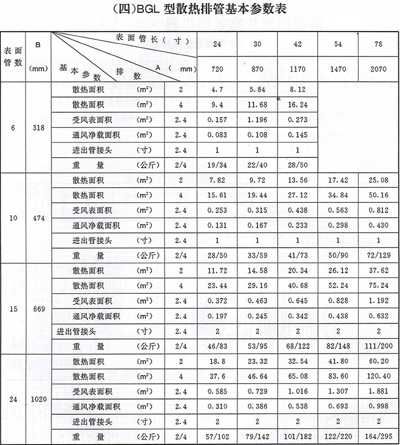 BGL型蒸汽散熱器,可分二排、四排、六排,當(dāng)然也能制單排,以及其他非標(biāo)形式,每種型號(hào)均有大小不同的規(guī)格,在此只標(biāo)常規(guī)型號(hào)、規(guī)格。其中外殼、無(wú)縫不銹鋼管¢18×2m/m均用1Cr18Ni9Ti材料,其翅片管用鋁軋制而成,翅片管外徑為¢38mm,根徑為¢19mm,其片高為9.5mm,片距為R片(3m/m),翅片管呈螺旋狀。